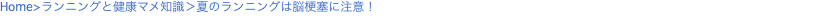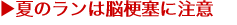 最近の調査で、脳梗塞は冬より むしろ夏場に多く発症することがわかってきました。 脳梗塞は、脳内の血管がつまり、血液の流れが滞ることで、脳に十分な酸素や栄養を供給できなくなる病気です。 突然発症し、致死率が非常に高いことが特徴です。また仮に一命を取り留めたとしても、深刻な後遺症が残る可能性が大きく、できればお近づきになりたくないやっかいな病気です。 従来は気温が低く血流が悪くなりがちな、冬に発症することが多いと考えられていました。 ところが、むしろ夏場こそ発症のリスクが高く、警戒しなければならないことがわかってきました。 特に夏にトレーニングをするランナーは、ランニング中いつ発症してもおかしくないくらいの心構えで、予防をしていただきたいと思います。
