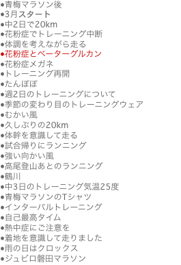 花粉症が治った! くしゃみが出たり鼻水が出たり、ひどい症状です。特に鼻水は走っている時に出ると呼吸にも影響するのでトレーニングのやり方事態を考えなくてはいけません。それに去年まではなかったのですが、今年から微熱があって風邪をひいいているような体調です。それで前々回走ったときは途中でトレーニングを中断したほどです。 ところが、、 その花粉症がぴたりと治ったのです。 まあ正確にいうと、目が多少かゆかったり、くしゃみを1〜2回する程度の症状はありますが、今までと比べると格段と良くなっています。 何をしたかというと「ベーターグルカン」というものを飲んだだけです。 知り合いからすすめられて飲んだのですが、そもそもは免疫力を強くしてガンや糖尿病の予防に効果がある、という話しだったのです。それで1日1袋飲んで10日くらいたったでしょうか。 昨日から花粉症の症状がまったくといっていいほど消えているのです。昨日、今日と花粉の飛ぶ量が減ったのかなとも思いましたが天気予報では例年の何倍もの花粉が飛んでると言うし、妻は相変わらずひどい症状です。 βーグルカンの効果しか考えられません。 もともと自然界ではアガリスクなどの猛禽類に含まれている物質ですが、黒酵母を醗酵させると生成されることがわかったということです。化学的には「ブドウ糖」の一種なので、飲んでも副作用などの心配はありません。「糖」ですが小腸で吸収されにくい性質があるので、血糖値があがるとかカロリー過剰になる心配もいらないそうです。 さまざまな後期のガンや糖尿病に対して高い治癒力を発揮した例が多数報告されています。 まさか花粉症に効くとは思ってもみなかったのですがまあ免疫力を高める作用が働くのならそれも納得ですね。 というわけで今日は体調も良かったのですが、足が重くあまり快適にははしれませんでした。それでも13.5kmを1km6分のペースでしたが。 あの青梅マラソンが終ったあとはゆっくり走っているつもりでも1km6分のペースだったのに、ここ数日はけっこう飛ばして走っている感じで1km6分ですから、少し後退している感じです。 |